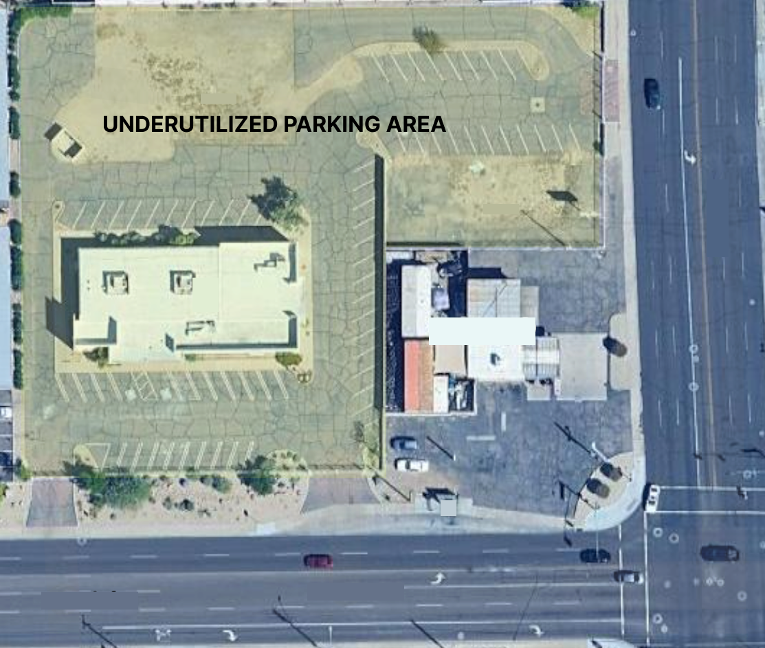 The parking area appears larger than the building’s operational needs. Many retail parcels built under older zoning requirements contain more parking than the current use actually needs.
